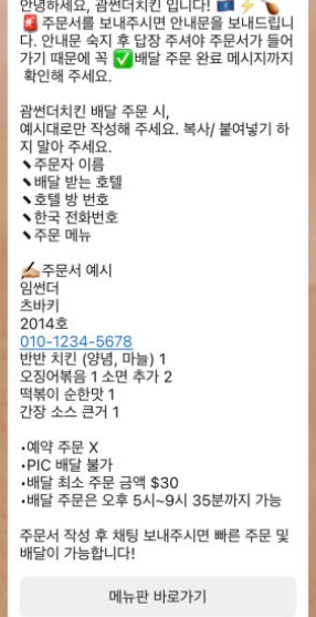 - 주문 양식에 맞춰 작성 (이름/호텔명/방번호/한국 연락처/주문 메뉴)