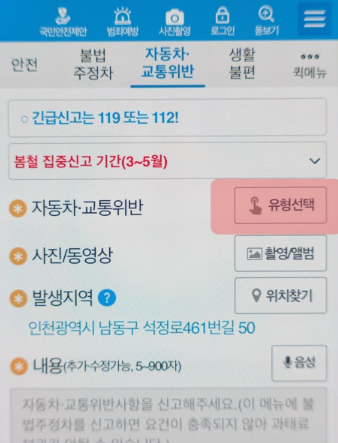 - 안전신문고 앱에서 ‘교통법규위반’ 항목 선택 후 제보